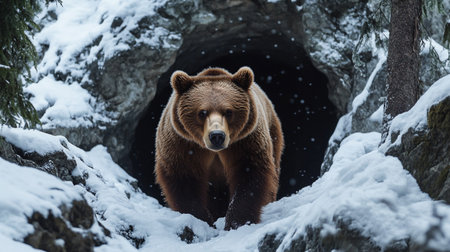 Grizzly bear in a cave in the mountains in winter