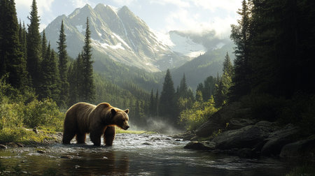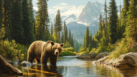 A grizzly bear fishing in a crystal-clear mountain stream