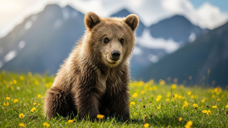 Brown bear cub sitting on a meadow with yellow flowers and mountains in the background
