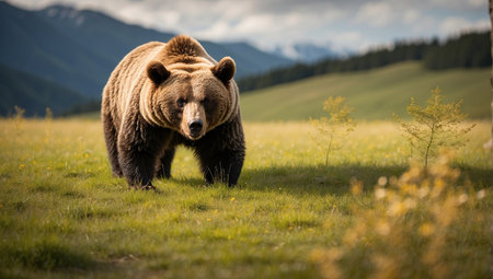 Majestic brown bear sitting on green hills with blurred mountains and misty sky in the background, showcasing nature's wilderness and wildlife beauty