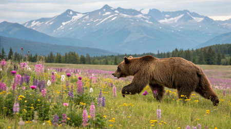 Brown bear on a meadow with wildflowers and mountains in the background