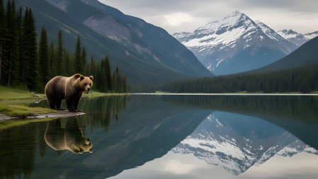 A large Grizzly bear stands at the water's edge of a calm mountain lake, reflecting in the glass-like surface. Majestic snow-capped mountains and a dense pine forest form a breathtaking backdrop.