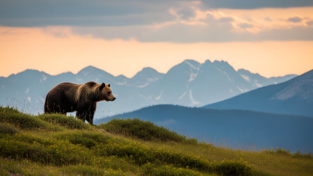 A large grizzly bear walking along a grassy mountain ridge during the golden hour. The background features layers of blue mountains, highlighting the bear's silhouette against the vast wilderness.