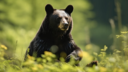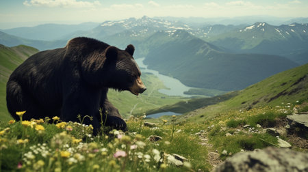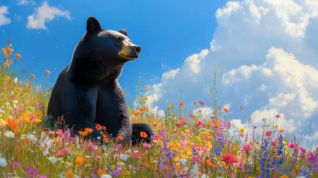 A serene bear relaxes among vibrant wildflowers under a bright blue sky, capturing the essence of peaceful wildlife in its natural habitat.