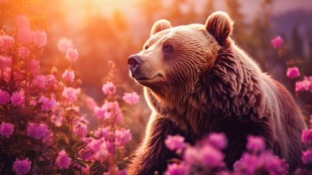 Cute, beautiful bear in a field with flowers in nature, in sunny pink rays. Environmental protection, nature pollution problem, wild animals. Advertising for a travel agency, pet store, veterinary clinic, phone screensaver, beautiful pictures, puzzle