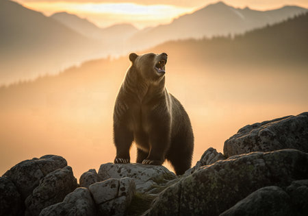 A large brown bear roaring on a rocky mountain ledge against a golden sunrise
