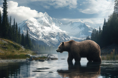 Grizzly bear in river with scenic mountain backdrop, natural lighting, wide angle