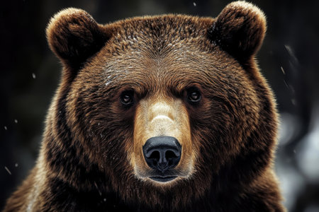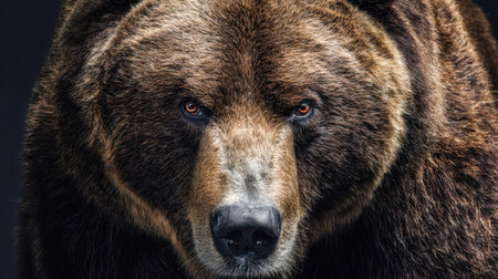 A commanding face of a rugged brown bear emerges from darkness, revealing fierce eyes and dense fur that showcases raw strength and untamed wildness.