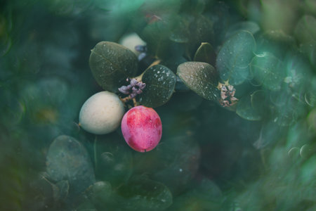 Red berries growing in the garden, observed through the magnifier glass and enlarged
