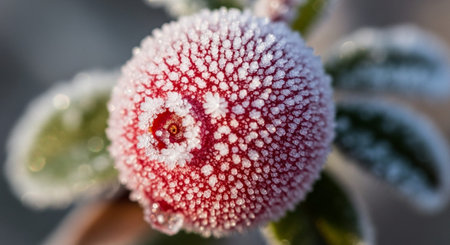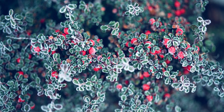Frost covered branches with red berries and dense green foliage. Seasonal nature on a cold winter morning.