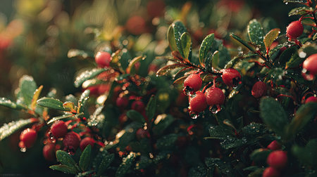 A panoramic wide view of Barberry field growing closely together in a dewy morning shining droplets on leaves warm soft daylight ultra realistic photography cinematic wide composition lifelike natural scene