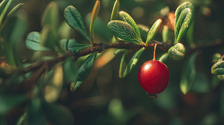 A detailed photograph of a single Cranberry, swaying gently in the wind, captured in natural daylight. Fresh and airy atmosphere, soft motion blur on leaves, crisp details on textures, background softly blurred into natural greenery, cinematic natural light, realistic photography style.