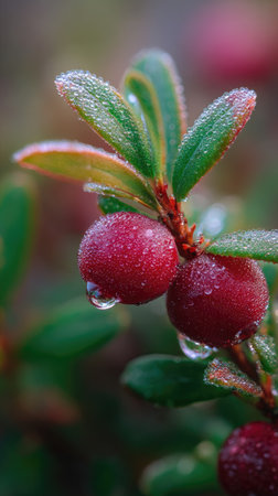 Lingonberry swaying gently in the wind, realistic photography style, bright and vivid colors, natural lighting, detailed textures on the leaves, soft motion blur to suggest wind movement, ultra realistic, high resolution, cinematic atmosphere.