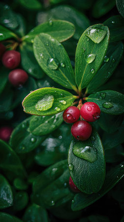Lingonberry in gentle light rain, soft raindrops visible on vivid green leaves, natural realistic style, bright fresh colors, balanced wide composition, cinematic framing, highly detailed.