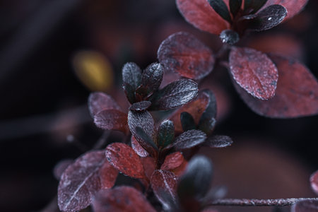 Mess of blurred and focus berberis thunbergii branches with dark red leaves. Atmospheric ruby color autumn background with blur place for text