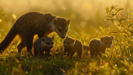 A heartwarming scene depicts a mother animal and her young in warm sunlight, showcasing their bond and playful interaction in a serene natural setting.