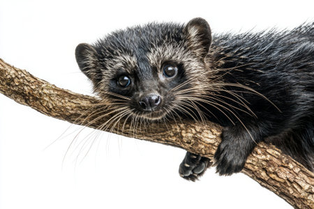 playful binturong clings to a sturdy branch, its long, prehensile tail draping elegantly while its curious eyes gaze into the distance, captured in a tranquil moment.