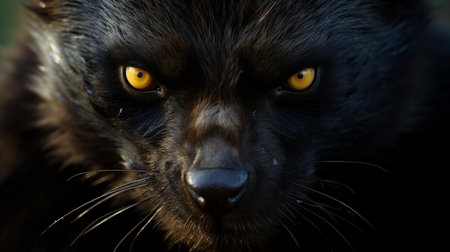 Portrait of a black fox with yellow eyes. Close-up.