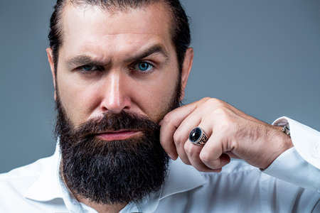 Portrait of bearded male in white shirt. Close up of handsome beard hipster elegant male. Bearded man close up. Beard is his style. Male with mustache growing