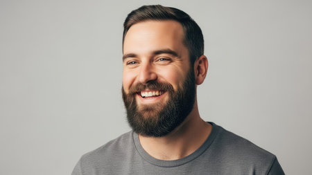 A man with a full beard and short hair smiles broadly in a studio setting. The image features a shallow depth of field, with the focus on the subject's face. The lighting is soft and diffused against a plain gray backdrop. This portrait could be suitable for various commercial or editorial applications.