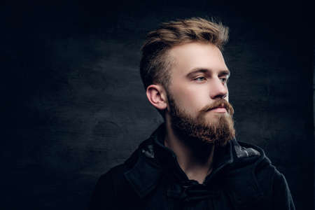 Portrait of a bearded urban male isolated with contrast illumination on grey vignette background.
