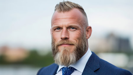 Confident adult caucasian male with beard in suit outdoors.