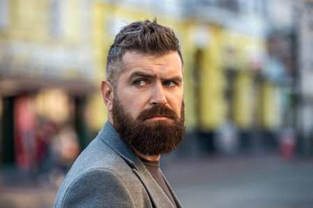 Stylish businessman in street, lifestyle portrait. Urban style. City street and stylish man. Bearded man in city street. Businessman business style on street. Business man in urban city