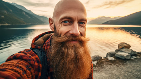 A bald man with beards taking a selfie in the mountains with a river behind him Generative AI Illustration.