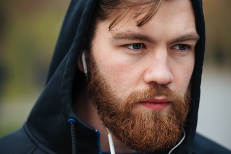 Portrait of handsome confidence man with a beard outdoors