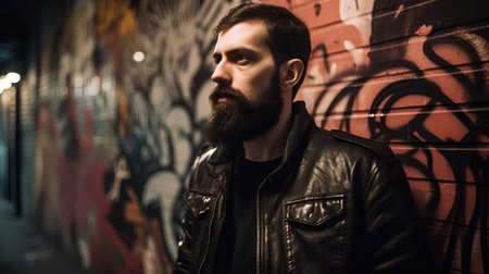 portrait of handsome bearded man in leather jacket and hat looking at the camera.