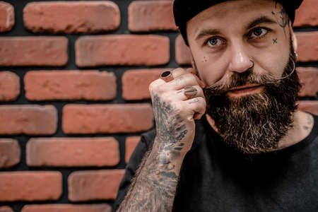 Portrait of handsome old-fashioned hipster in t-shirt and cap, touching his beard. On a brick background.