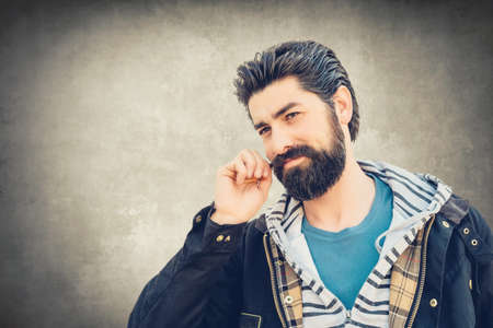 Stylish bearded hipster male. Portrait of a brunette man with a beard in the studio. Stylish haircut for a man.