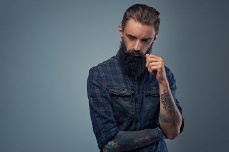 Portrait of bearded male with tattoos on his arms, dressed in a plaid flannel shirt over grey vignette background.