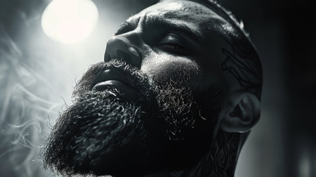 Close-up studio portrait of fashionable bearded man looking forward posing on black background. Dramatic light, emotions and feelings concept