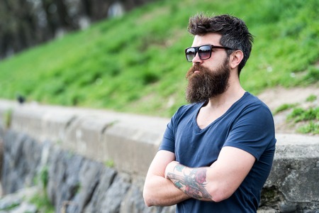 Confident posture of handsome man. Guy masculine appearance with long beard. Barber concept. Beard grooming. Beard care. Masculinity and manliness. Man attractive bearded hipster posing outdoors