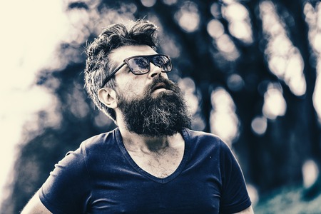 Barbershop and style concept. Man with beard and mustache on strict face, nature background, defocused. Hipster with beard looks confident while standing outdoors. Bearded man wears modern sunglasses