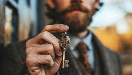 Businessman holding key from house flat apartment in hand of smiling male. Blurred portrait of confident man professional realtor offering new dwelling real estate unit to potential buyer. Close up. Key of success portrait