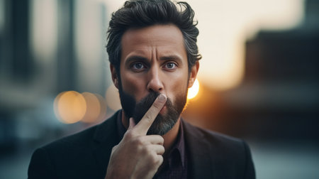 A contemplative man with a well-groomed beard and short hair gazes off into the distance, capturing a moment of introspection in a softly lit environment.
