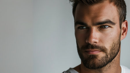 A contemplative man with a well-groomed beard and short hair gazes off into the distance, capturing a moment of introspection in a softly lit environment.