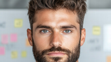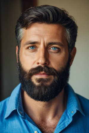 Portrait of a confident man with a beard and piercing blue eyes looking directly at the camera