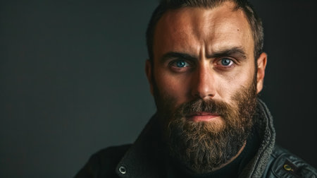 A man with a beard and blue eyes. He has a serious look on his face. Concept of confidence and masculinity