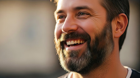 A close-up portrait showcases a man with a full beard, laughing openly. Warm lighting highlights his face and teeth. The image has a soft focus background, creating a shallow depth of field. Suitable for various commercial and editorial applications to represent positivity.