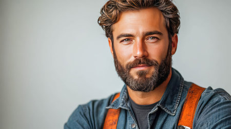 Portrait of a rugged man with a beard, wearing a denim jacket and leather suspenders, looking confidently at the camera, capturing a casual and authentic style.