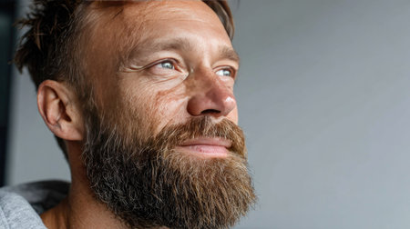 Portrait of a thoughtful bearded man gazing intently with natural light.