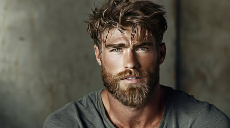 A rugged man with a full beard and messy textured hairstyle, standing against a rustic backdrop, embodying a casual and adventurous spirit