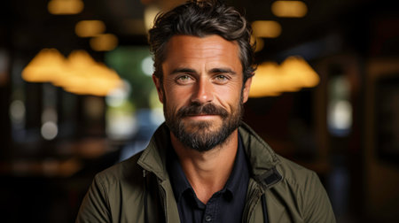 A confident man with a stylish beard smiles warmly in a modern cafe with inviting decor and soft lighting, capturing a relaxed yet professional vibe.