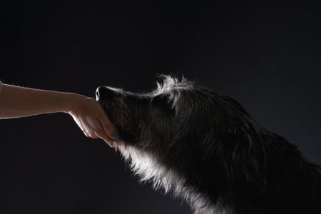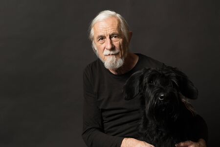 Low key studio portrait of beautiful gray hair old man and his Big Black Schnauzer Dog.