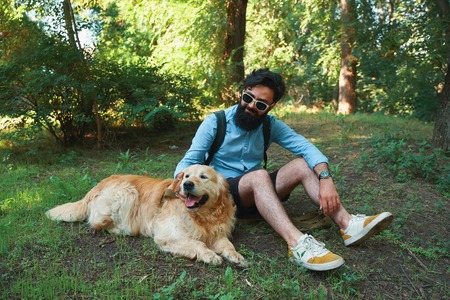 The theme is the friendship of man and animal. Caucasian young male and pet dog breed Labrador Golden Retriever at home inside in winter. Christmas time, New Year holidays.