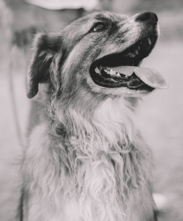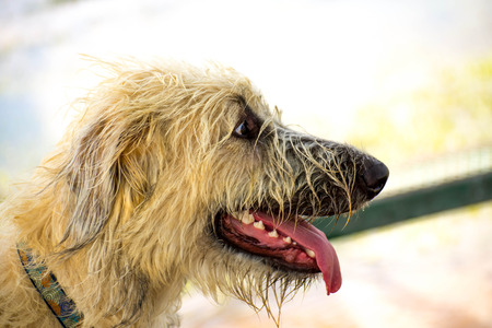 Portrait of a shaggy dog mongrel on a walk in the park on a sunny day