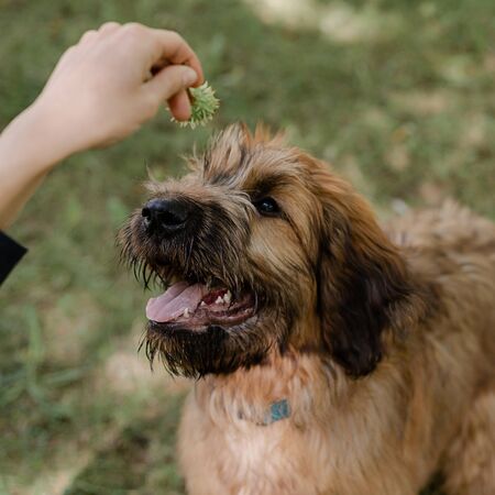 A puppy of red briard or french shepherd is playing and running commands on the meadow in the summer day.
